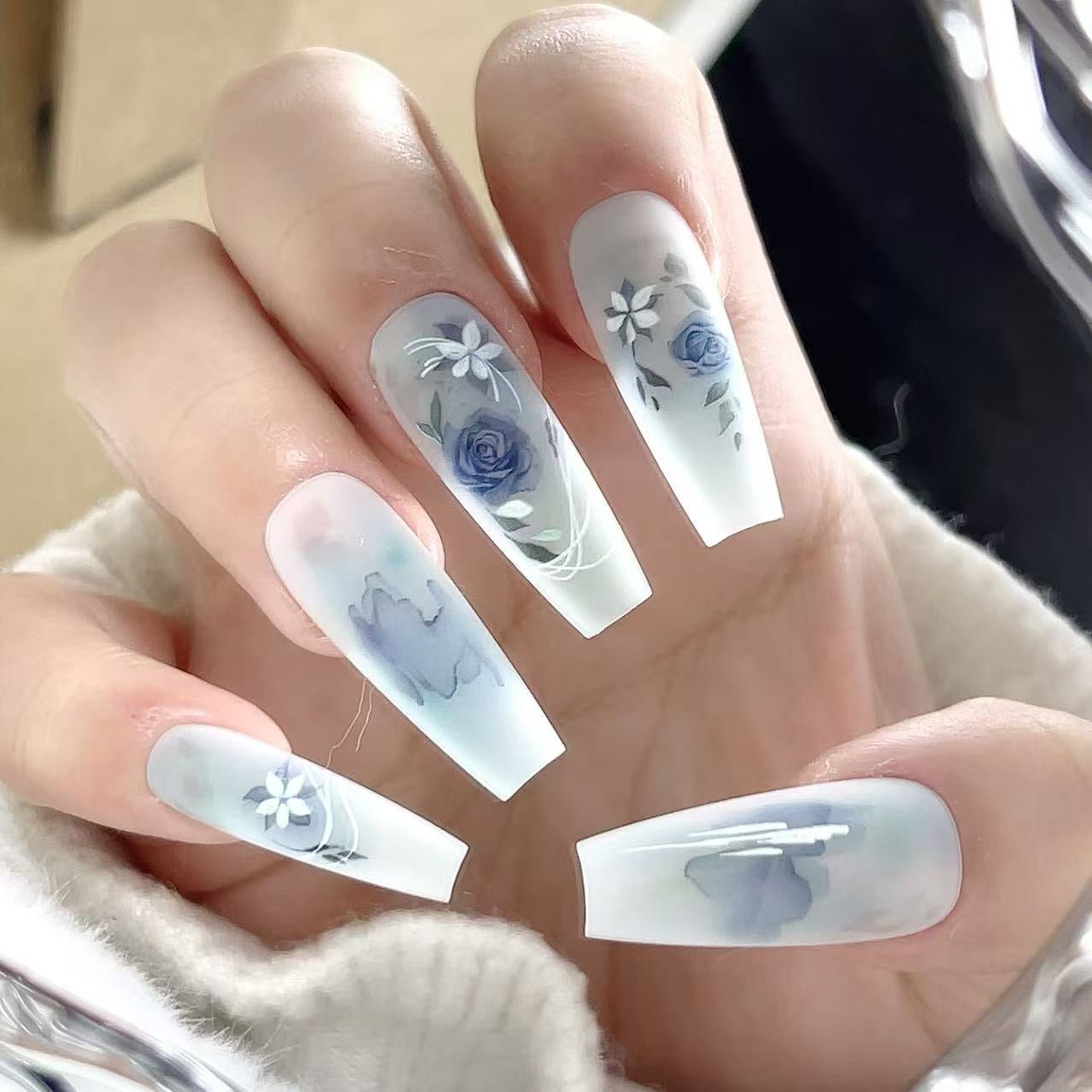 Blue Floral Watercolor Press-On Nails – Handmade Art Design | Made Armor Collection